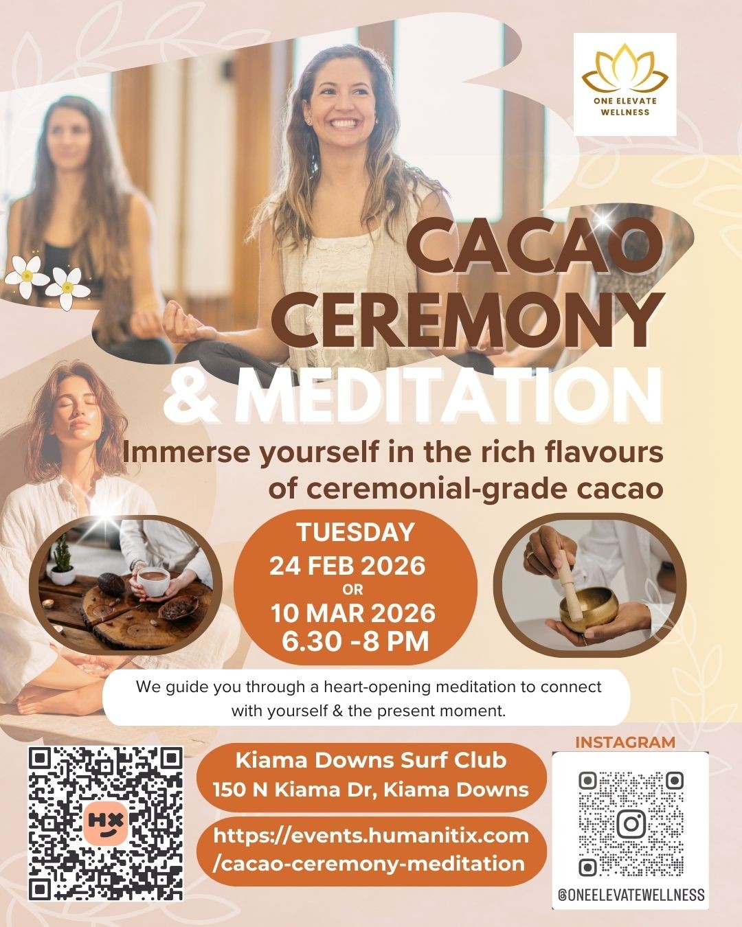 Come join us for a soothing and grounding cacao ceremony and meditation at the Kiama Downs Surf Club. Immerse yourself in the rich flavors of ceremonial-grade cacao as we guide you through a heart-opening meditation to connect with yourself and the present moment. This event is a wonderful opportunity to relax, reflect, and rejuvenate your mind, body, and spirit. No experience necessary, just bring an open heart and a willingness to unwind. We look forward to sharing this special experience with you!