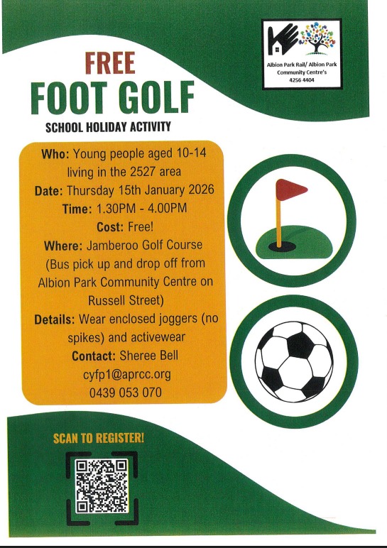 Do you live in Albion Park, Albion Park Rail or Oak Flats areas and are looking for an activity for your 10 – 14 year old during the January school holidays then why not come along to Foot Golf.