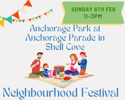 The neighbourhood festival aims to bring the community together in Anchorage Park at Shell Cove. Theme is unity and working together. There will be BBQ sausage sizzle to fundraise for the local school, crafts for children, music and games.